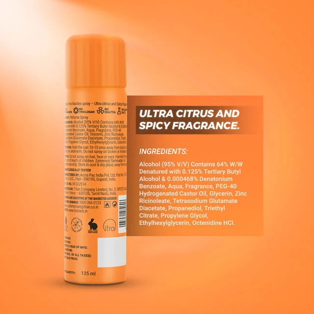 For this “No Nasties” range, we have gone above and beyond to create a product line that is free from any potentially harmful chemicals like paraben, triclosan, DEA/TEA, aluminium salts etc. Captivate the senses of all in your vicinity as you indulge in the meticulously formulated Fastrack No Nasties Perfume Spray – Fierce, that boasts an ultra-citrus, aromatic, and woody accord. Allow yourself to be swept away by the symphony of fragrant notes, each carefully selected and harmonized to create a sensory experience that is nothing short of extraordinary.
